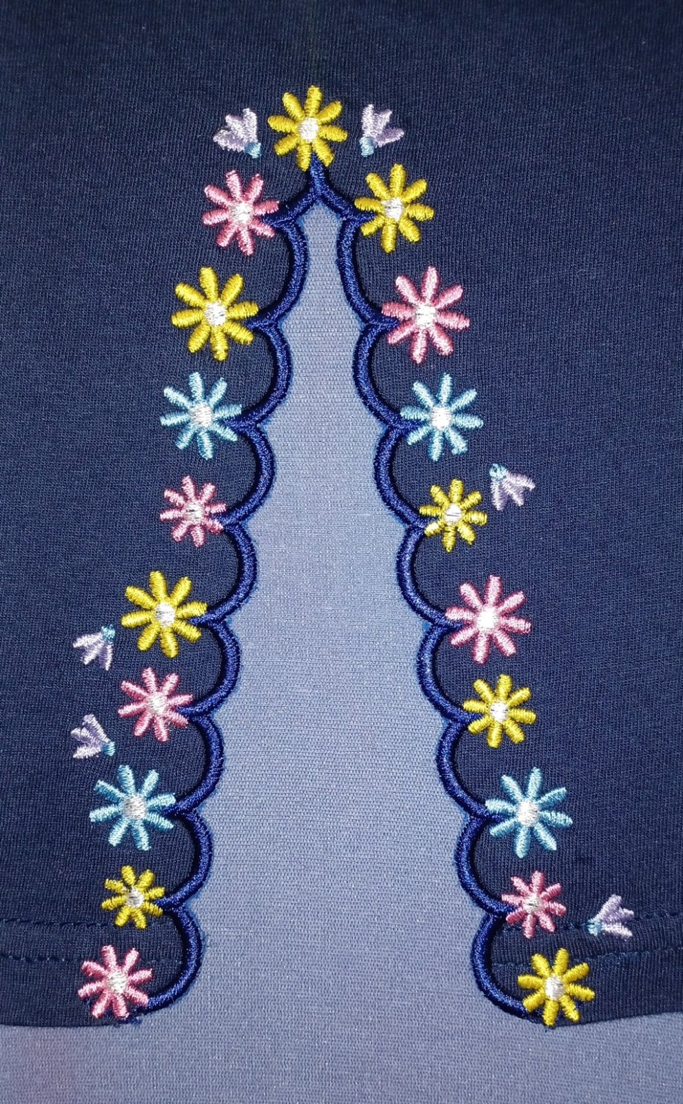 You will receive two different designs: Flowers Split Seam in 5 sizes (pink T-shirt) and Spring Floral Split Seam in 3 sizes (navy T-shirt).